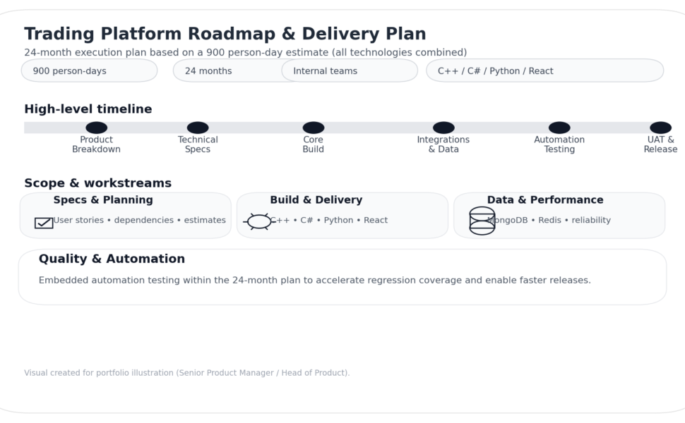 Leading retail trading platform modernization through a 900-person-day program roadmap, migrating from a desktop app to a cloud-based web application, and defining product requirements, user stories and UI/UX enhancement.