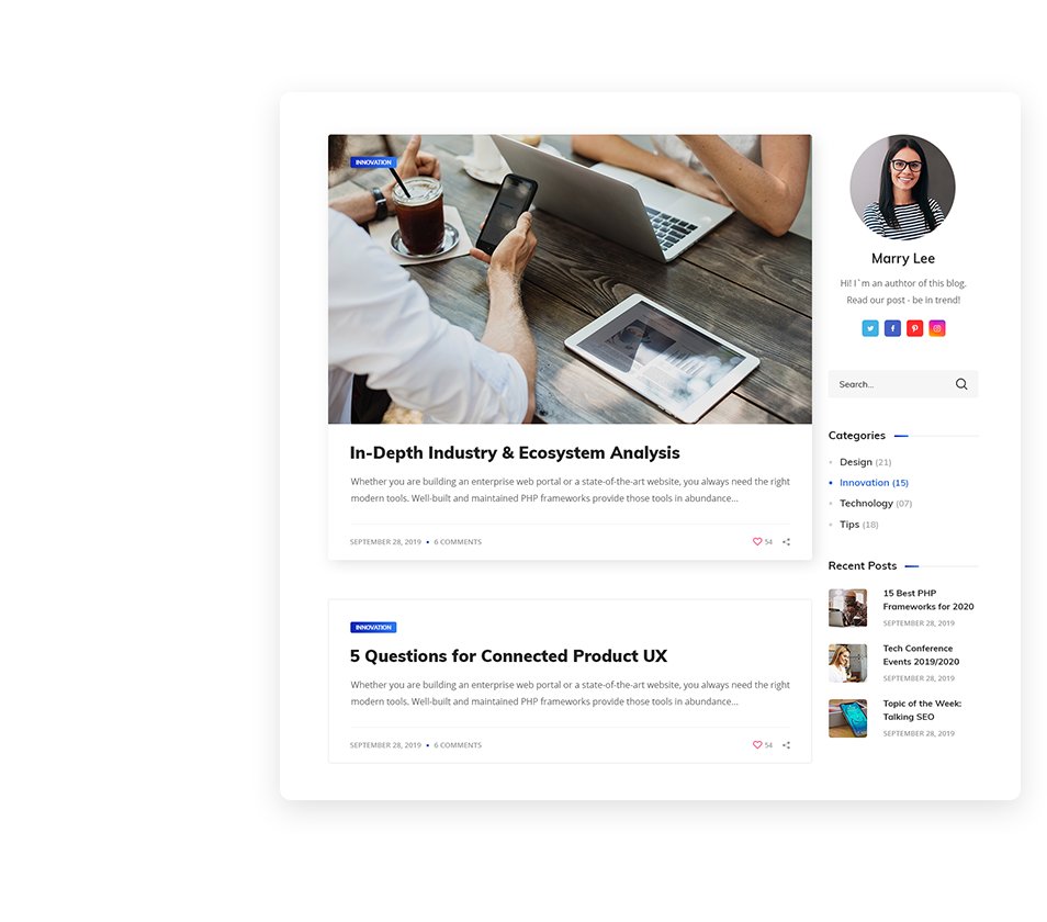 Show your gorgeous projects using our portfolio, which includes different styles like: gride, masonry. Masonry layout allows displaying projects as a fancy column-based. Grid is a perfect solution in case you need to display projects in columns.
